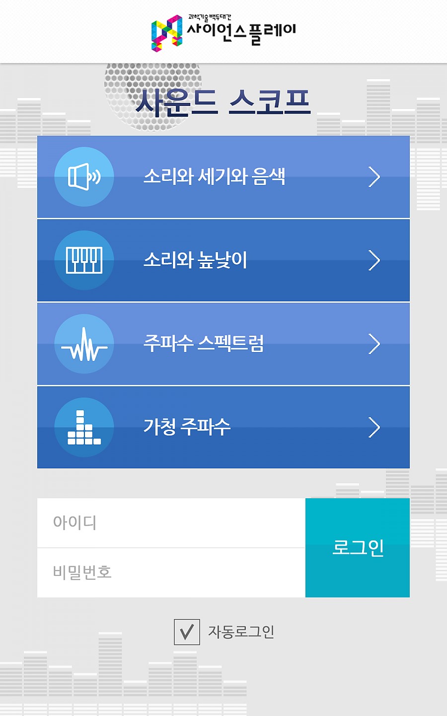 완료 | [체험학습앱]사운드스코프 페이지 정보 작성자 실장 작성일16-02-23 10:00 조회3,723회 댓글0건 관련링크 http://sciencelevelup.kofac.re.kr/contents/detail?pageIndex=1&list_typ… 1153회 연결 이전글 다음글 목록 본문 사이언스플레이-콘텐츠 - 사운드스코프 댓글목록 등록된 댓글이 없습니다. 이전글 다음글 목록
