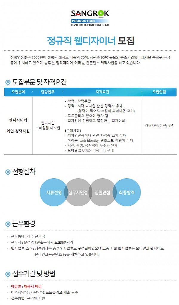 채용 진행중 | 경력직 웹/UI 디자이너 충원 모집 페이지 정보 작성자 관리자 작성일17-04-05 10:33 조회8,856회 댓글0건 이전글 다음글 목록 본문 [ 온라인 지원] 댓글목록 등록된 댓글이 없습니다. 이전글 다음글 목록